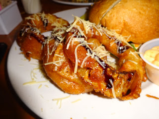 I already knew what I was going to have before even walking in the door of Dad's because I had seen this burger on Triple D. What you have here is the Dad's Burger ($14 plus $3.50 for the upcharge of getting onion rings). This burger patty was encrusted with plenty of bacon and the blue cheese crumbles were inside the burger. This was a delicious burger, and worthy of all the praise it receives. The burger patty was full of flavor and cooked to a very tender medium, the bun was soft and pliable, and what bound this burger all together for me was the very well done Aleppo chili spread that came with it. It added a touch of heat and the sauce kind of helped cut the blue cheese and bacon, which can sometimes overpower. Very balanced flavors here. The onion rings are fantastic at Dad's. They are heavily battered, but there's also a big onion in there, so they work. They are topped with parmesan cheese and a balsamic reduction which I thought was odd until I tried them. To push these rings over the top they came with a roasted red pepper aioli, which I could not get enough of, and even used it on my burger as well. A three and a half dollar upcharge for three onion rings might seem excessive, but you won't be sorry once you try them.