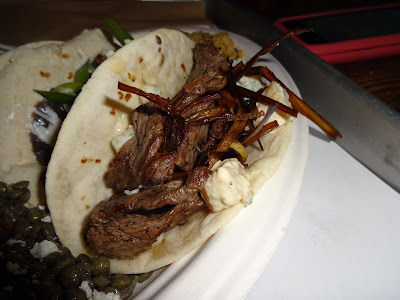 When I saw Bacon PB and J Taco ($4) on the menu, I had to try it. You might not think this would work like Slater's Peanut Butter and Jealousy Burger, but you'd be wrong. Included in the flour tortilla were roasted peanut butter, a carrot-ginger jam, greens, a strip of sweet and spicy bacon, and pickled Fresno chili. This was a very balanced taco. The carrot and ginger jam added a nice sweetness, while the plentiful amount of bacon here added a smokiness. It was all evened out by the smooth peanut butter. This is a taco I can see myself getting on every trip to Taco Asylum.