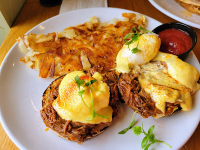 The everyday brunch menu at UD is served until 3:45pm. The menu features approximately 20 brunch items, accompanied by a selection of sides, beverages, and a rotating assortment of desserts. There's also another whole page of cocktails, beer, wine, and other boozy drinks for those who imbibe. Entree prices for brunch range between $15 and $26, and desserts hover around $14. We made our selections with the very peppy staff, and here's how everything came out for us.